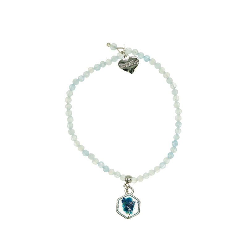 This beautiful handmade bracelet has a stunning pressed blue flower in resin. All these new flower resin charms are handmade here in our Hereforshire design studio using a fantastic eco-friendly resin. Each charm measures approx 1cm in diameter with my signature Silver plated Rosie Fox heart charm.