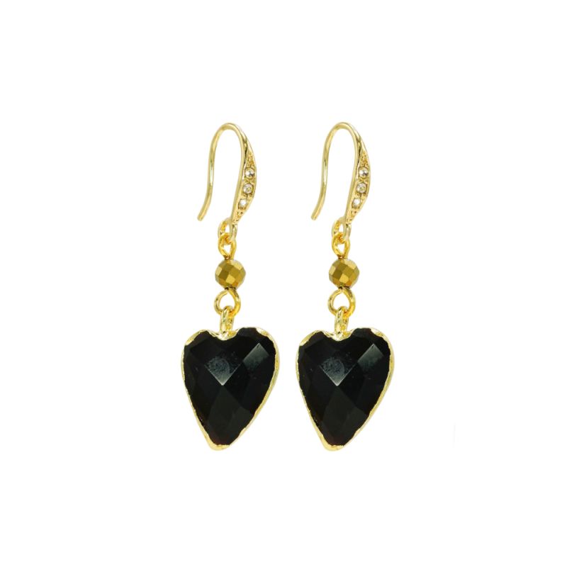 These stunning Black Spinel Gemstone Heart Earrings are handmade in the UK, they are crafted with beautiful Pyrite gemstone beads. They are hypoallergenic and made from 18ct Gold plated hooks which are embellished with sparkling crystals.