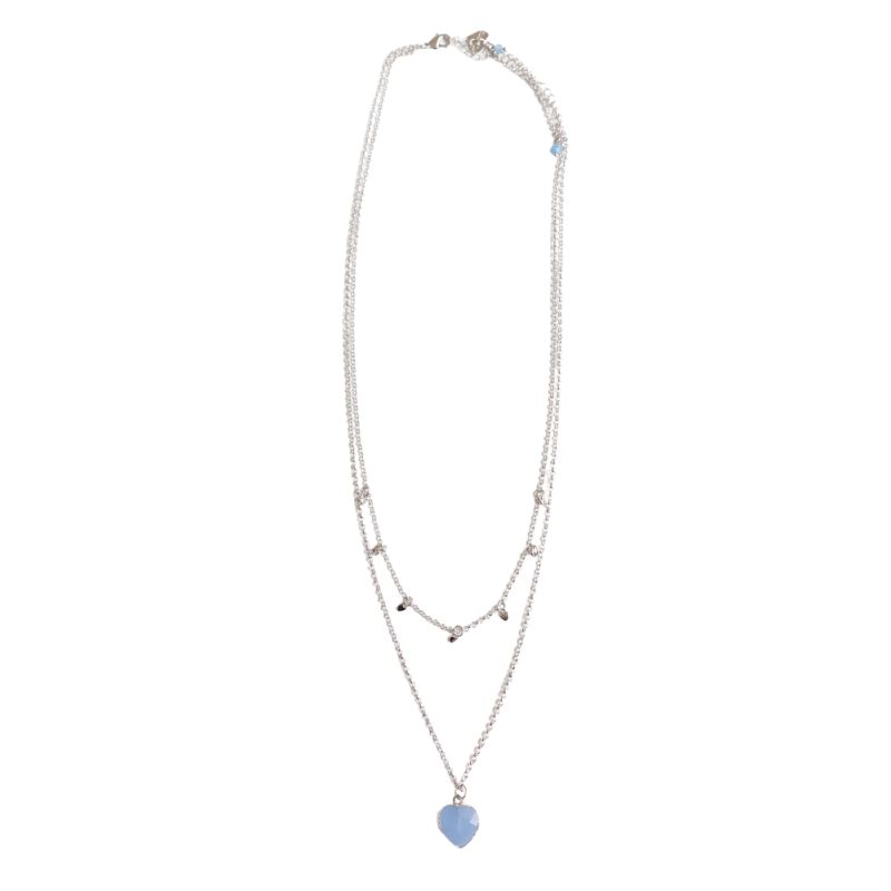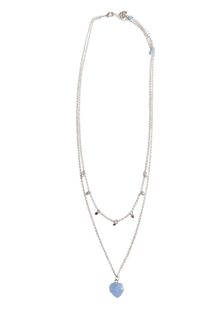 This contemporary hand finished double chain layer necklace features a delicate chain of silver hearts, blue Agate beads and a gorgeous Silver plated semi-precious blue Agate heart.