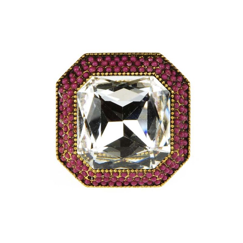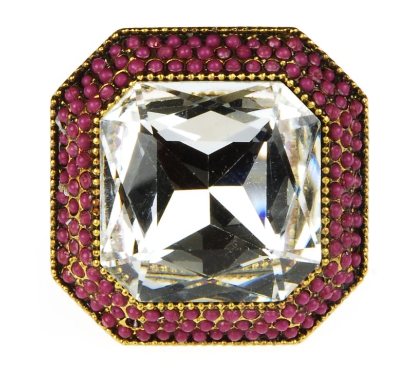A fine looking ring that boasts a statement crystal rock surrounded by pretty beaded detail. Approx 3x3cm.