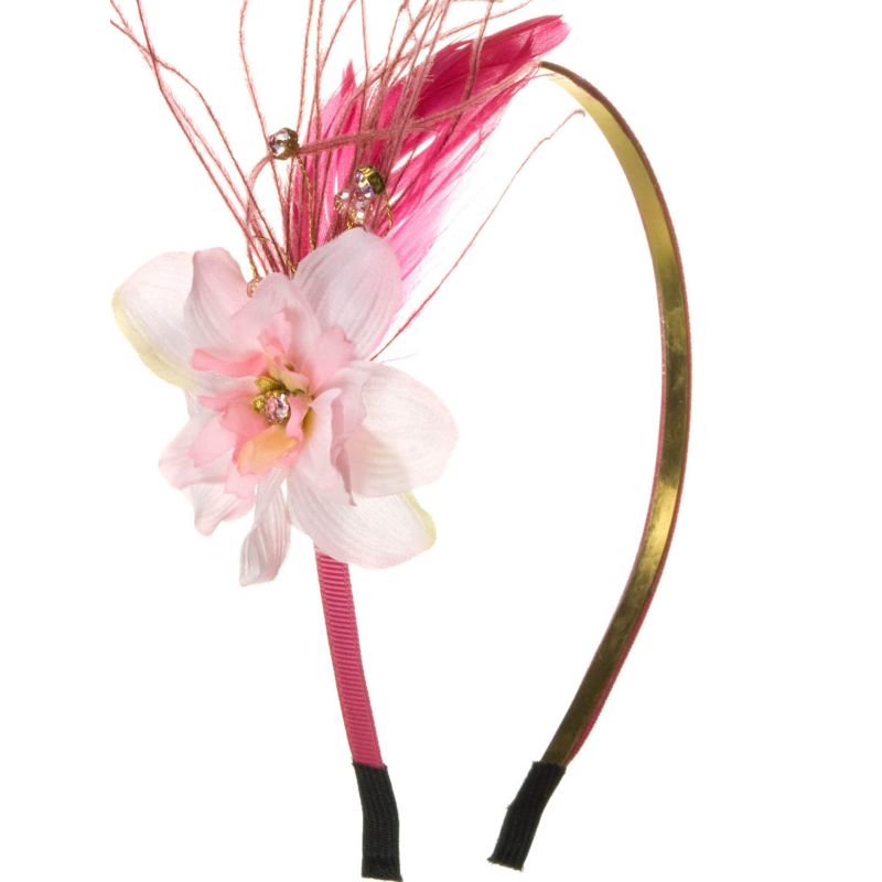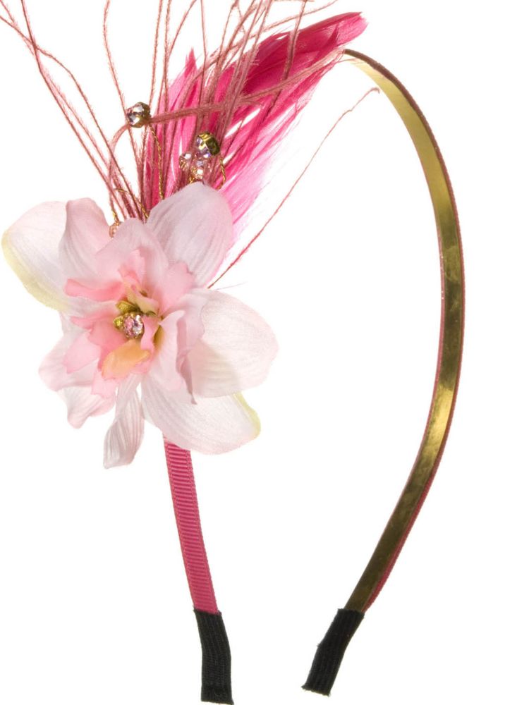 A charming pink headband with small blossom and feather detailing. Hair accessory available in other colours. Measurements: 6cm wide