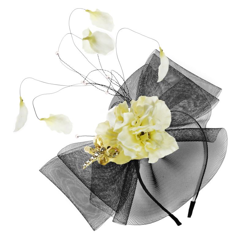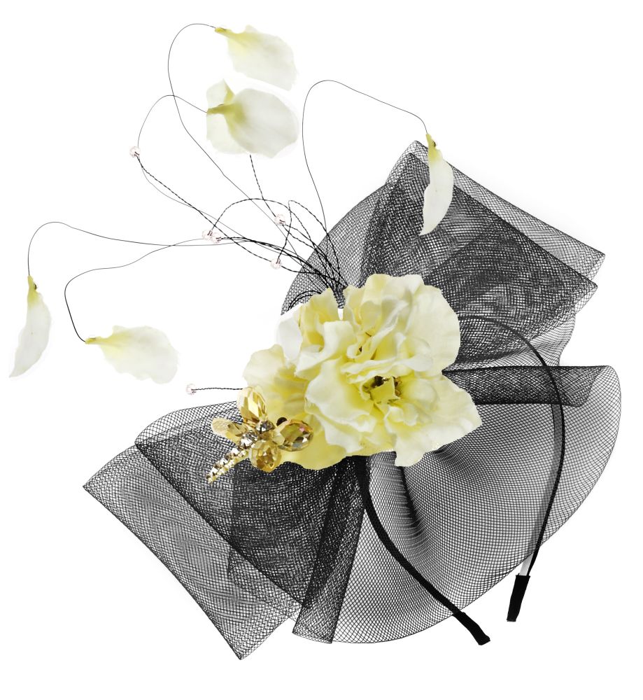 Adorn this hand made show stopping fascinator and make a statement. Boasting exquisite floral, crystal dragonfly and feather detail, this is an accessory that will wow when worn. Also available in fuchsia, cream and navy. Approx 20 x 25cm.
