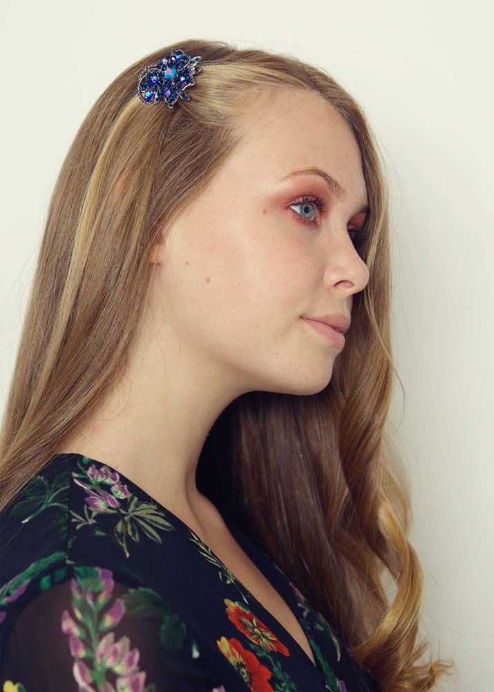 A stunning pewter floral bouquet adorned with deep blue and iridescent crystals. With a brooch pin and a hairclip on the back, this wonderful multi-functional piece can be worn as both a hair accessory or brooch. Measures approx 5cm x 4.2cm