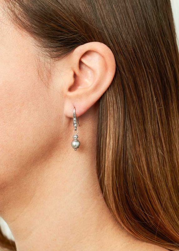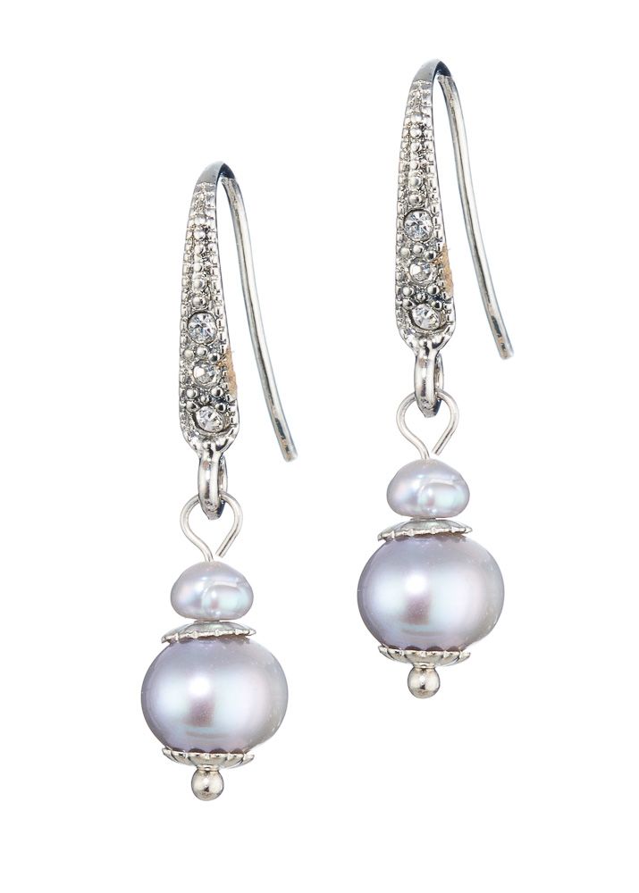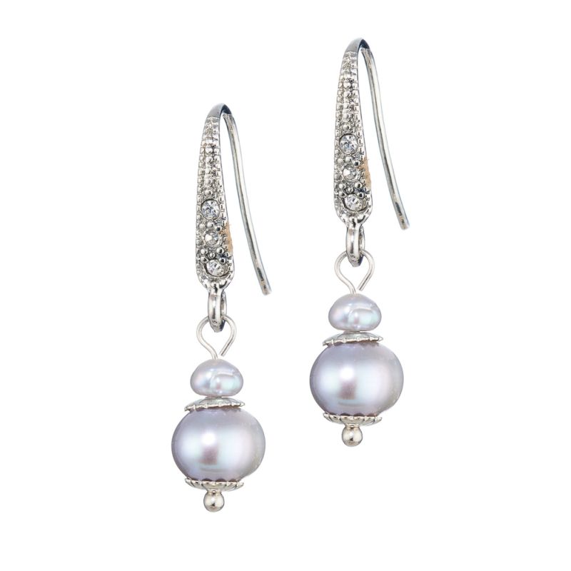 An elegant pair of silver plated, freshwater, grey pearl earrings. Handmade with clear crystals in the silver, and gorgeous grey pearls these earrings are also hypoallergenic. Measuring approx 3cm drop.
