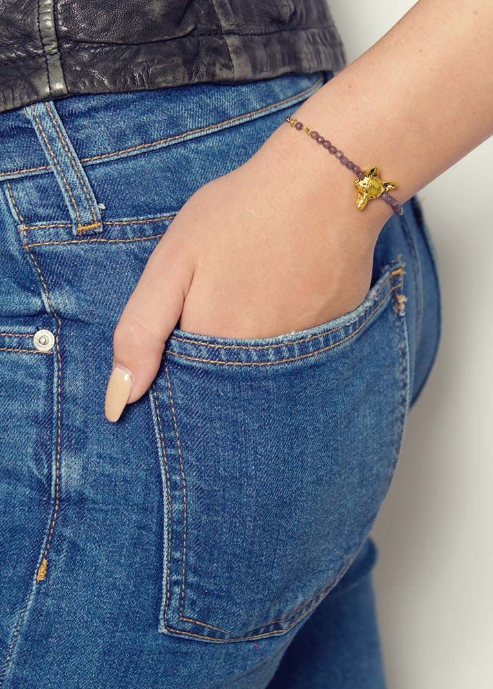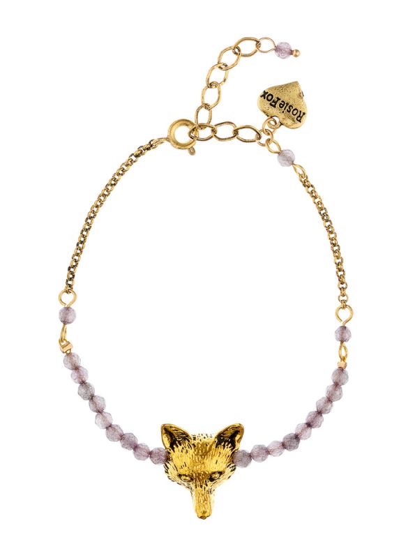 A stunning gold plated fox head and dove grey tone agate bracelet. Handmade, this on-trend bracelet is sure to make you smile. It is adjustable and finished with the signature Rosie Fox heart charm. Fox head measures approx 1.8cm.
