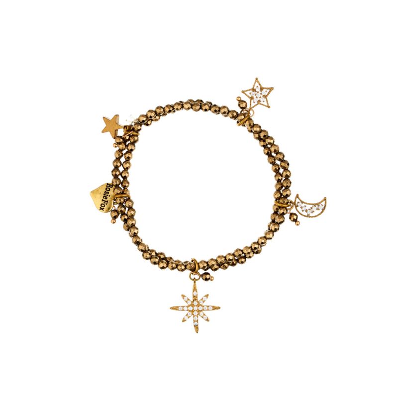 A wonderful semi-precious, handmade, charm bracelet. This stylish, gold plated bracelet is sure to make you smile with its fabulous crystal encrusted stars and moon charms set on beautiful gold pyrite beads. It is made with elastic so it is both adjustable and comfortable. Measures approx 2.5cm width.
