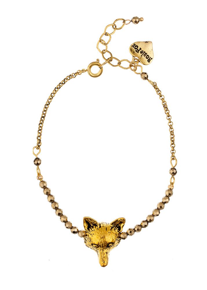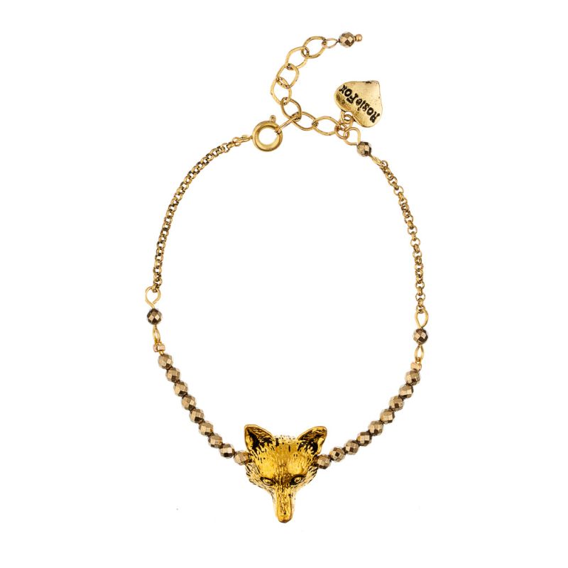 A stunning gold plated fox head and gold pyrite bracelet. Handmade, this on-trend bracelet is sure to make you smile. It is adjustable and finished with the signature Rosie Fox heart charm. Fox head measures approx 1.8cm.