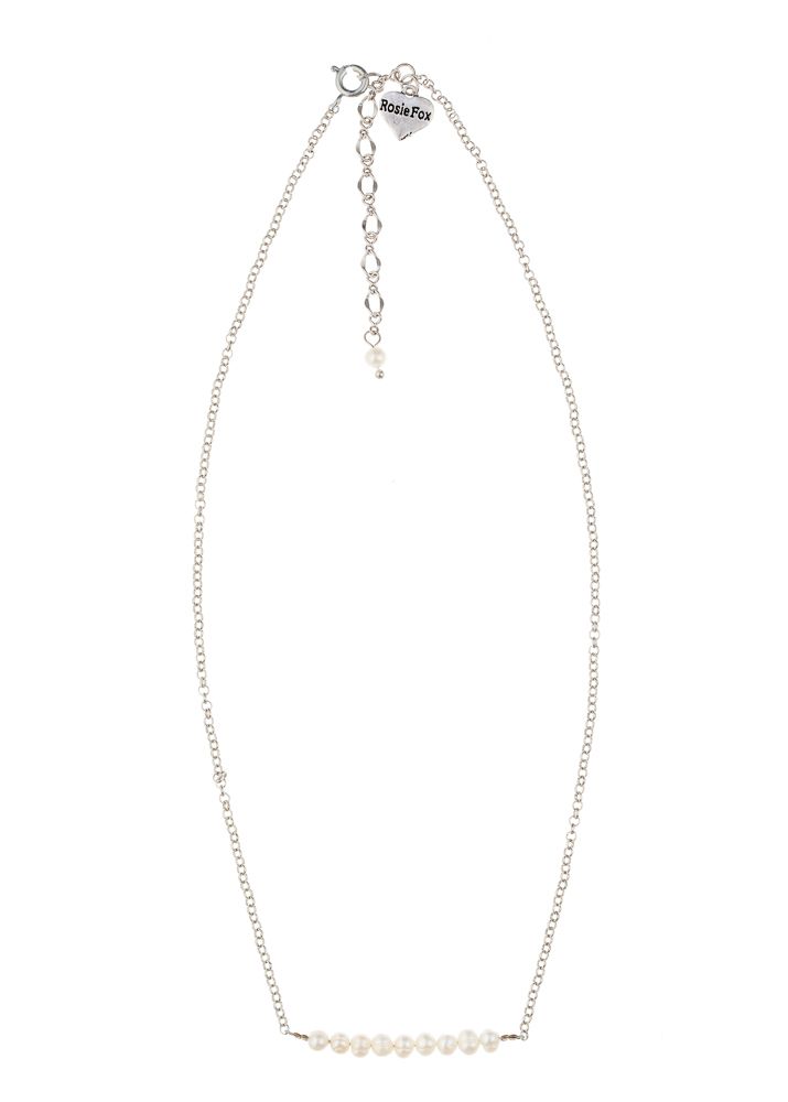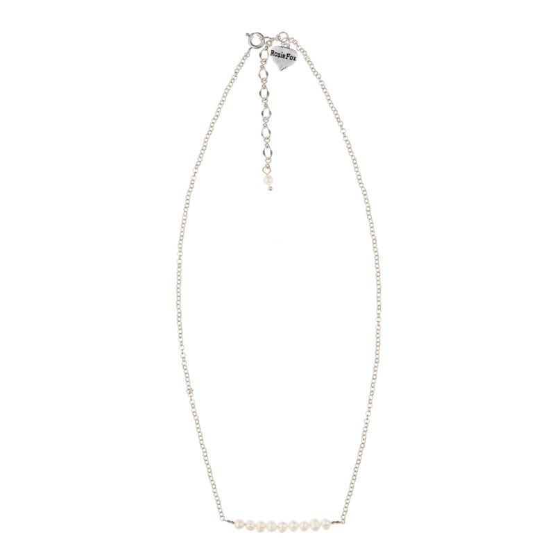 A wonderful handmade, silver plated necklace with a bar of freshwater pearls. This necklace sits beautifully and will dress up any outfit. The chain clasp can be worn at adjustable lenghts.