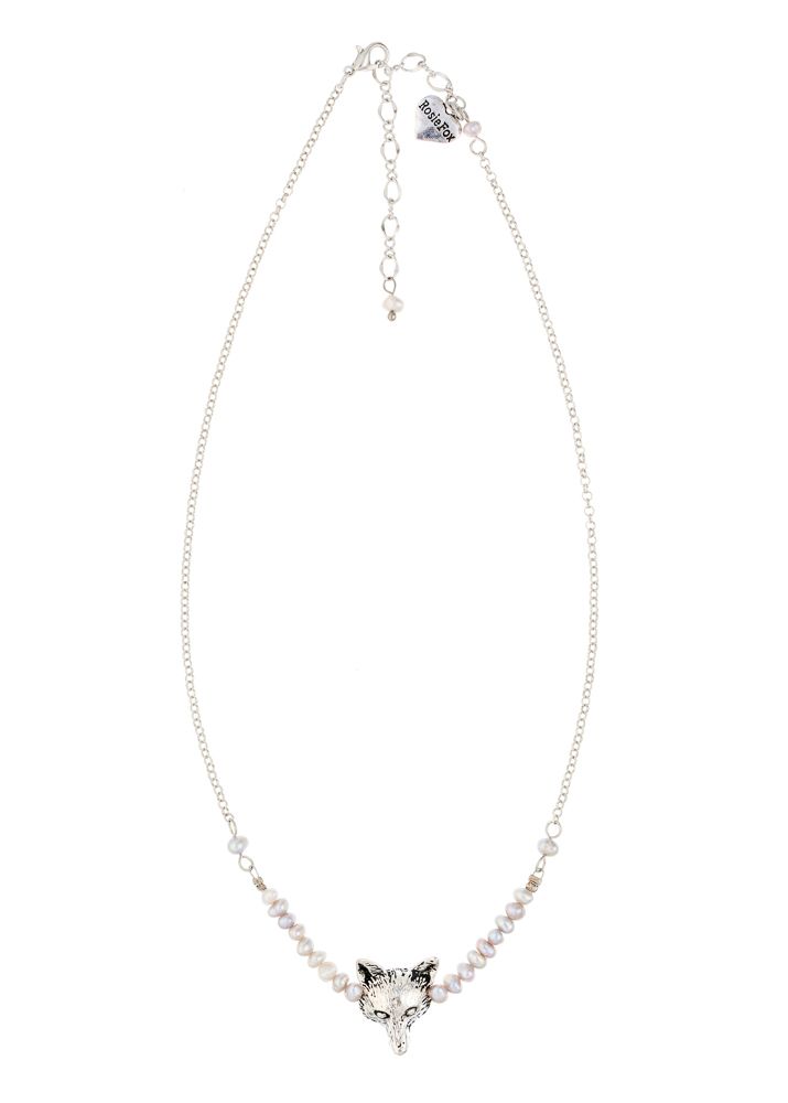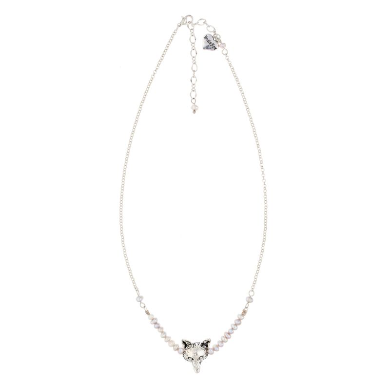 A wonderful handmade, silver plated fox head necklace with a bar of grey freshwater pearls. This on-trend, designer necklace sits beautifully and will dress up any outfit. The chain clasp can be worn at adjustable lenghts.