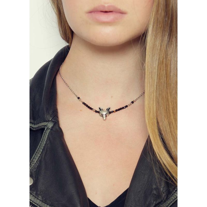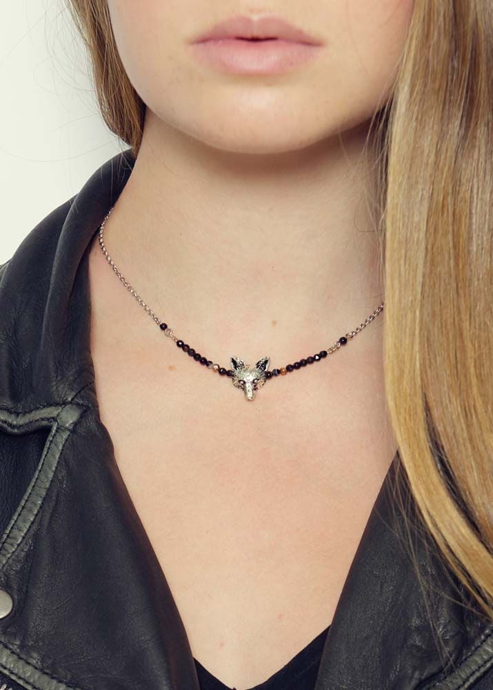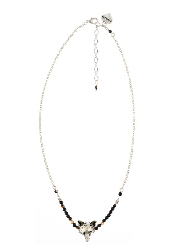 A wonderful handmade, silver plated fox head necklace with a bar of semi-precious black tone agate beads. This on-trend, designer necklace sits beautifully and will dress up any outfit. The chain clasp can be worn at adjustable lenghts.
