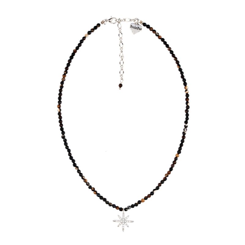 An elegant handmade, silver plated, black agate tone necklace. Embellished with a beautiful sparkling crystal star. Made with an adjustable chain clasp back. Star measures approx 1.8cm