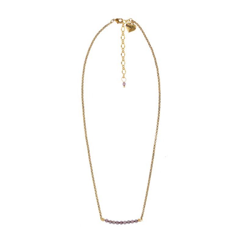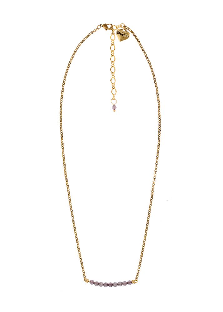 A wonderful, handmade, gold plated necklace with a bar of semi-precious dove grey agate beads. This necklace sits beautifully and will dress up any outfit. The chain clasp can be worn at adjustable lenghts.