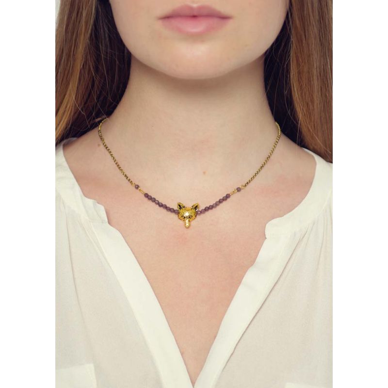 A wonderful handmade, gold plated fox head necklace with a bar of semi-precious dove grey agate beads. This on-trend, designer necklace sits beautifully and will dress up any outfit. The chain clasp can be worn at adjustable lenghts.