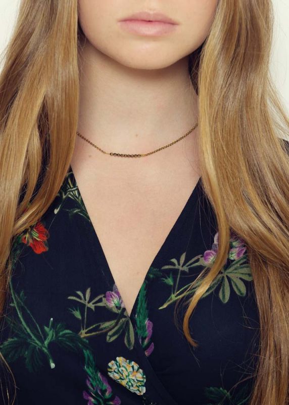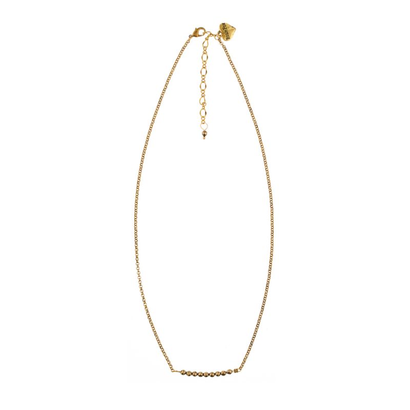 A wonderful, handmade, gold plated necklace with a bar of semi-precious dove grey agate beads. This necklace sits beautifully and will dress up any outfit. The chain clasp can be worn at adjustable lenghts.