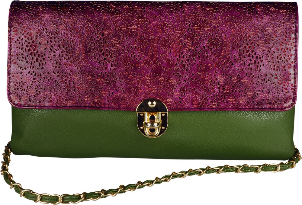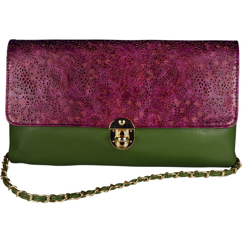 This striking on trend design is the perfect day to night hand bag in this beautiful two tone khaki and plum colours with detatchable chain strap can also be worn as a clutch bag. The striking lace lazered effect beautifully adds that special touch to make this bag really special. Measures approx 34 x 20cm