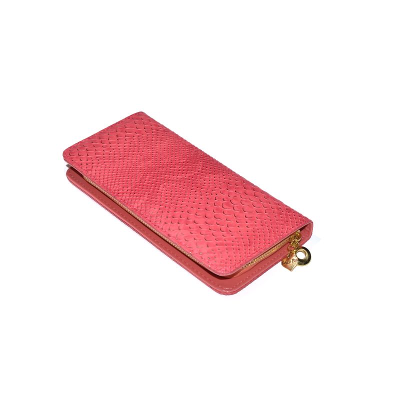 A fabulous salmon pink with gold fleck snake skin print wallet. With a zip closure and inside has 8 card places and two cash sections. A truly beautiful and stylish purse. Made of leatherette. Measures 21.5cm x 10.5cm