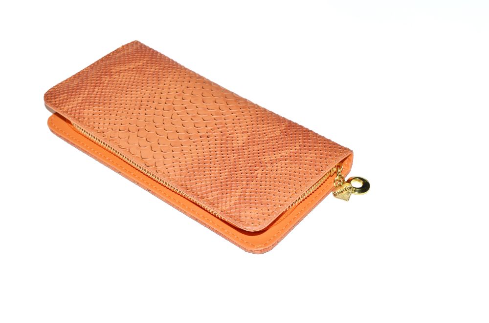A fabulous marmalade orange with gold fleck snake skin print wallet. With a zip closure and inside has 8 card places and two cash sections. A truly beautiful and stylish purse. Made of leatherette. Measures 21.5cm x 10.5cm