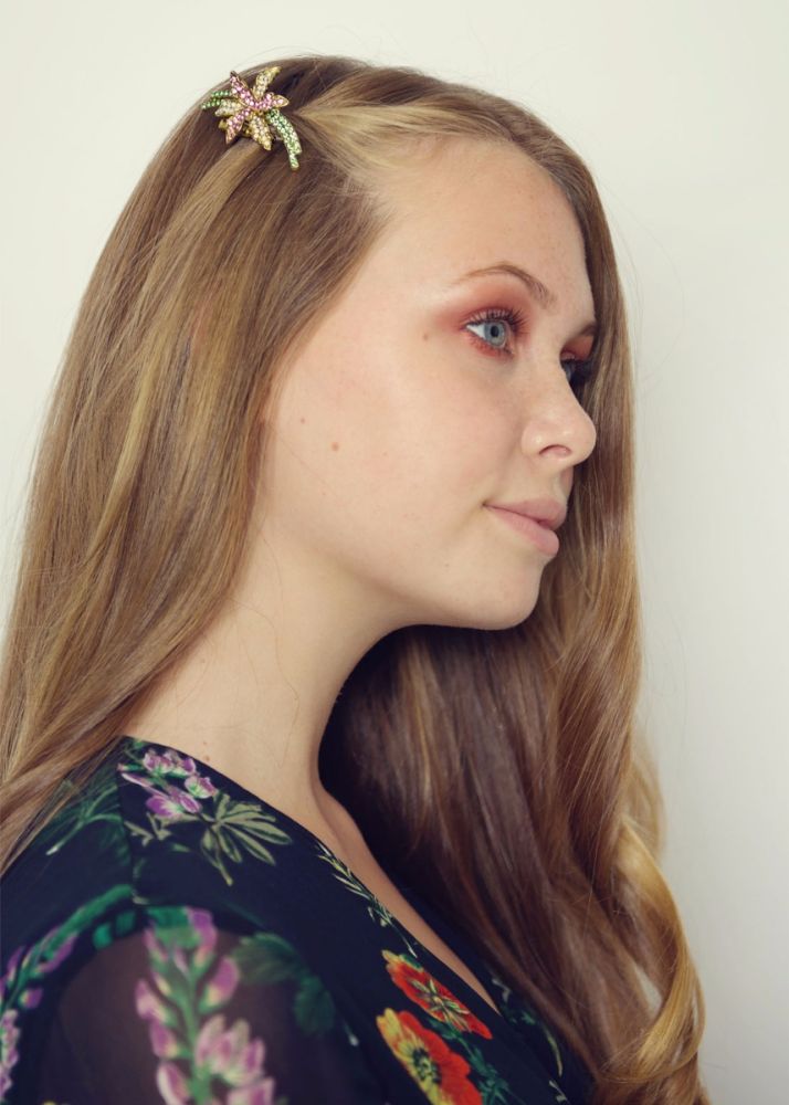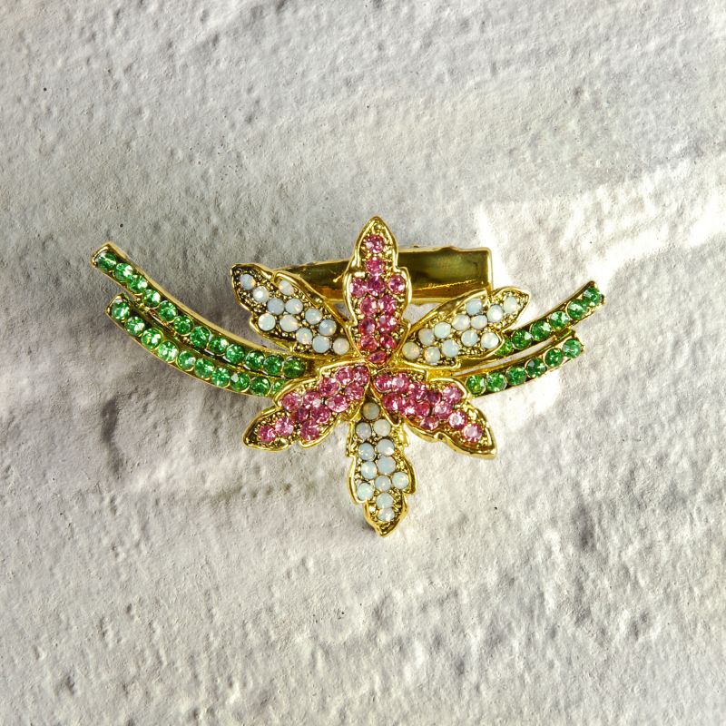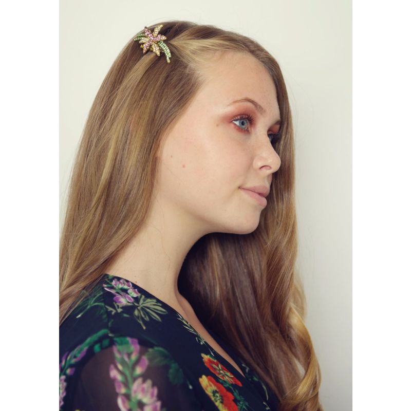 Add a touch of drama to your outfit with this beautiful sparkling crystal spray hair clip and brooch. Set on a gold base and decorated with stunning pink, green and opal crystals this statement piece is sure to turn heads.