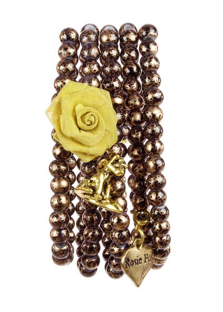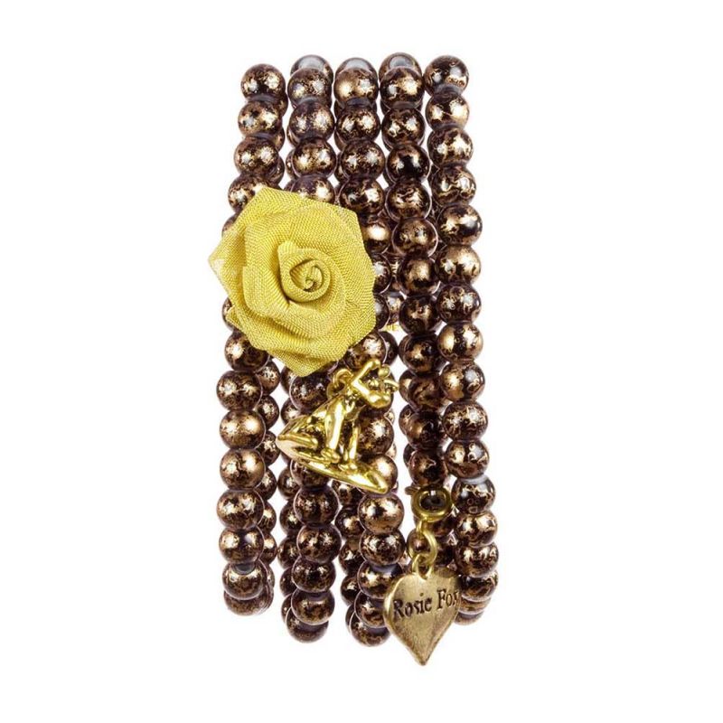 Multi-strand bronze-coloured beaded stretch cuff with Rosie Fox signature gold rose, fox and heart charms. 5cm wide.