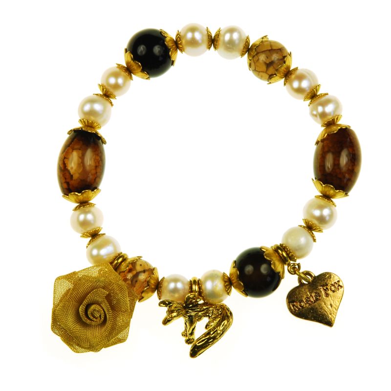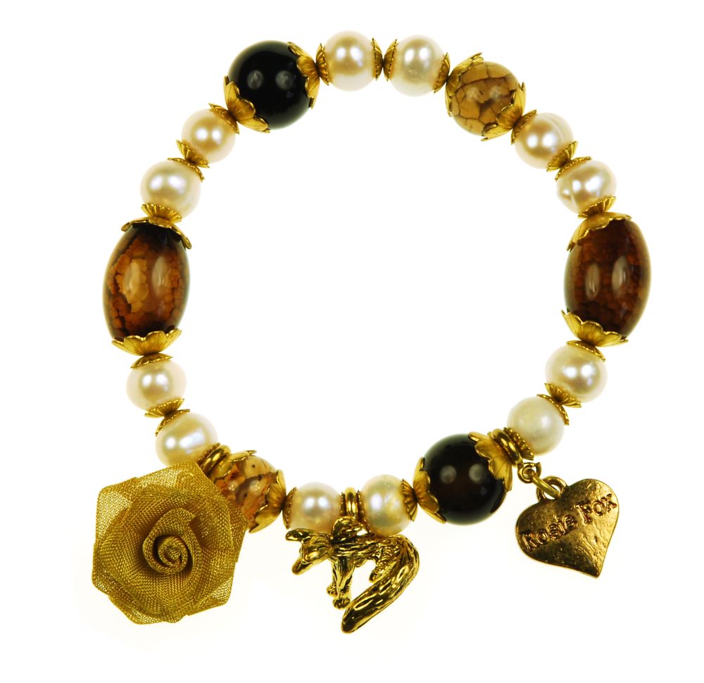 Single-strand freshwater pearl and natural semi-precious agate beaded bracelet with Rosie Fox signature fox, heart and rose charms. 1cm beads.