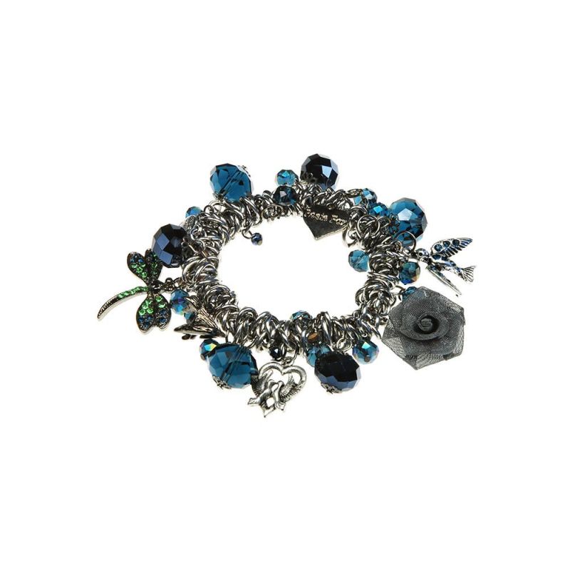 Fashionable and funky silver stretch charm bracelet adorned with blue crystal beads, dragonflies and Rosie Fox signature heart, rose and fox charms in silver. Approx 7cm diameter.