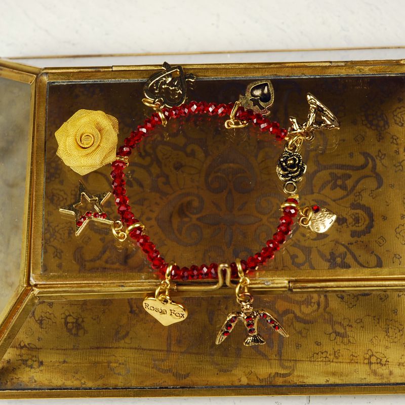 An elegant ruby red glass beaded friendship bracelet with vintage style charms. Rosie's signature fox and gold rose are accompanied by a perfect selection of charms. The beads are approximately 0.5cm.