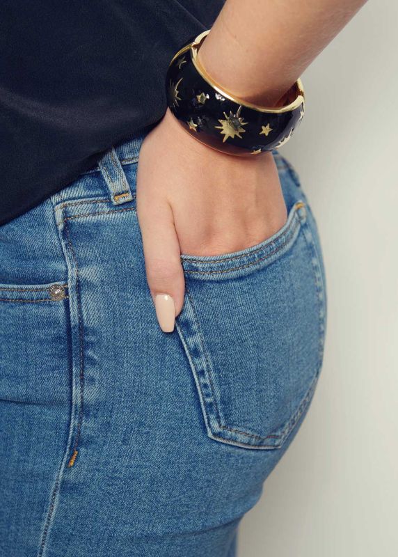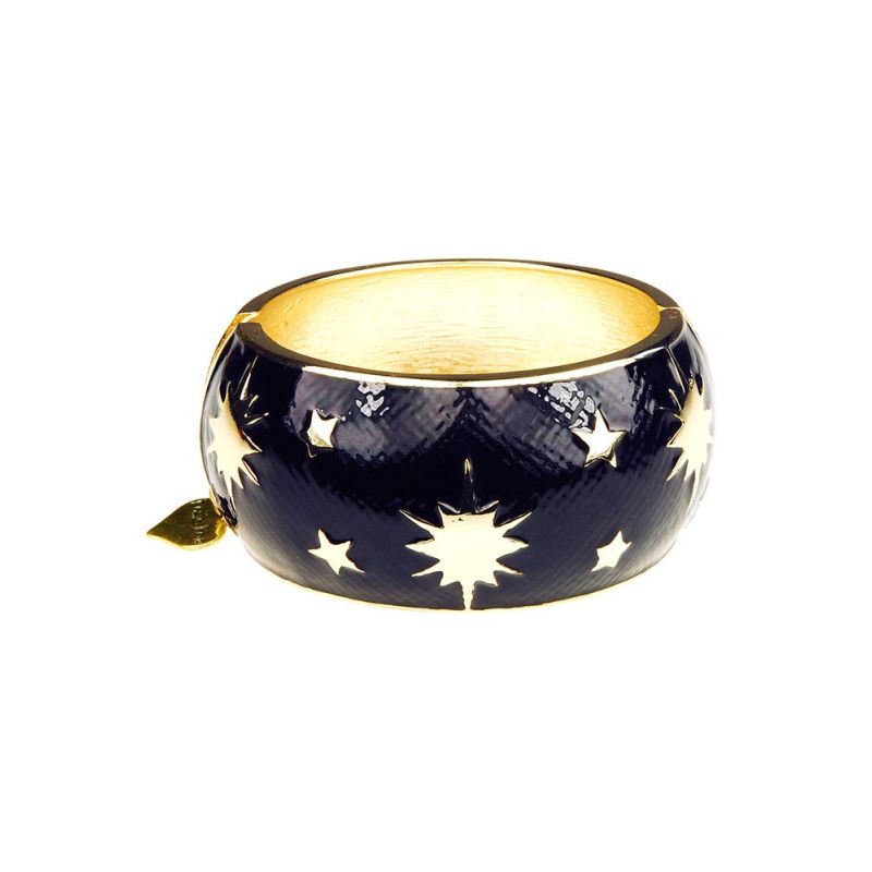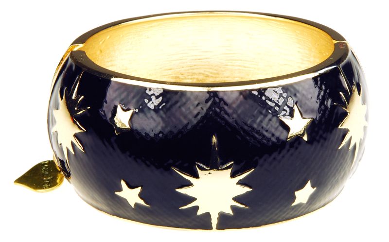 Make a statement in this fashionable jet bangle emblazoned with bright gold star motifs. Bracelet approximately 6cm wide.