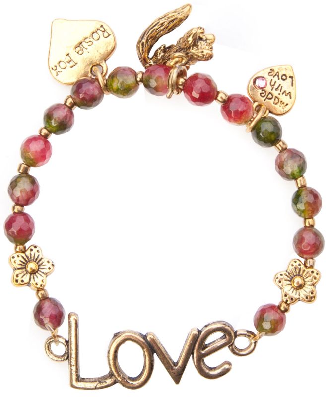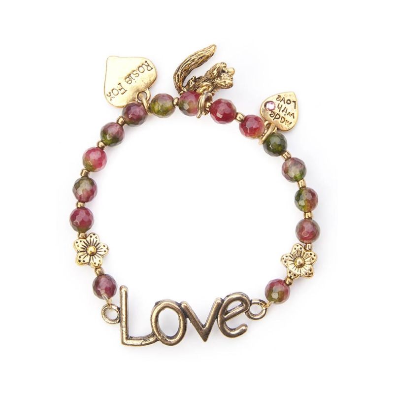 Beautiful natural tourmaline beaded stretch bracelet with central "LOVE" pendant, a 'made with love' heart charm and with the signature Fox and heart charms.