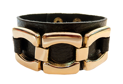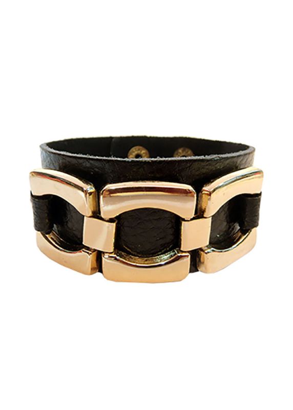 A unique statement black leather style cuff with a fabulous gold statement design. Measures approx 4cm wide