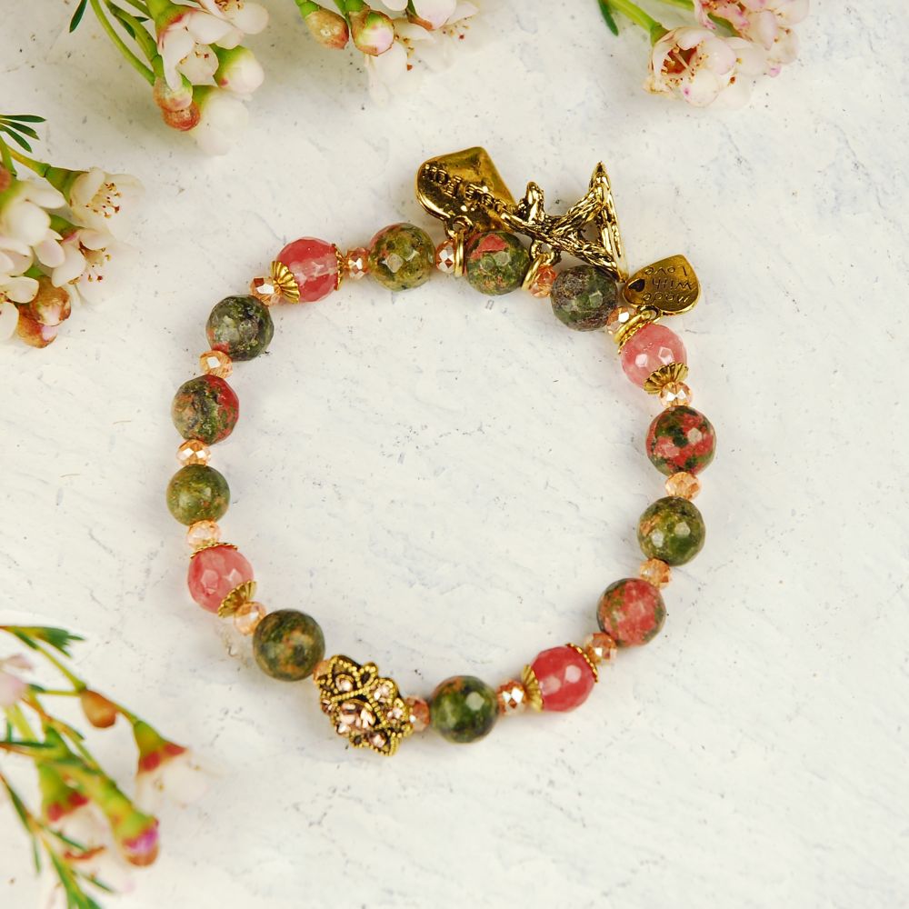 A beautiful vintage style pink and green colour bracelet made with natural unakite gemstone and crystal detail. Measures approx. 0.9cm width