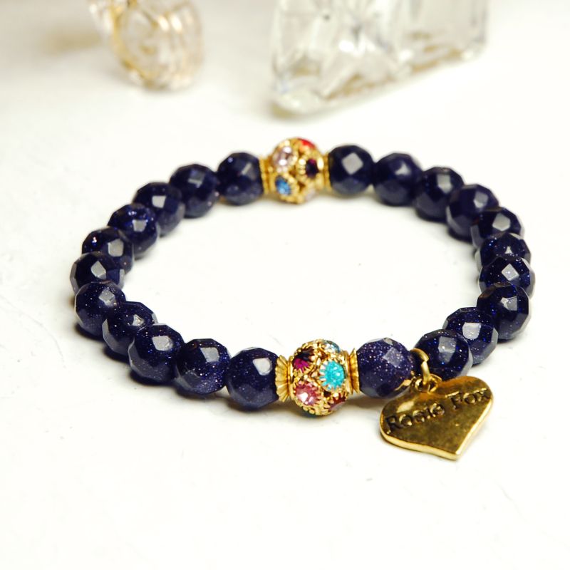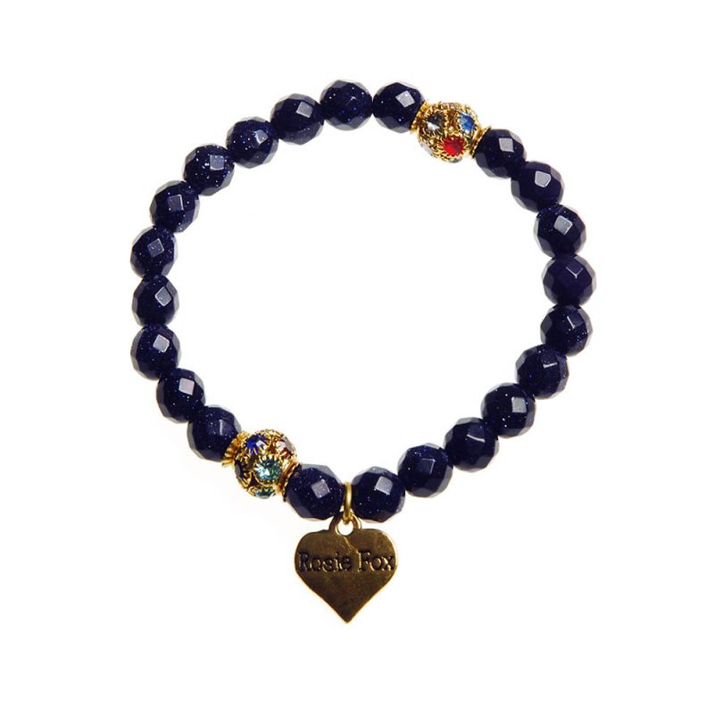 A beautiful handmade navy starstone gemstone bracelet, embellished with sparkling rainbow crystal beads and the signature Rosie Fox heart.