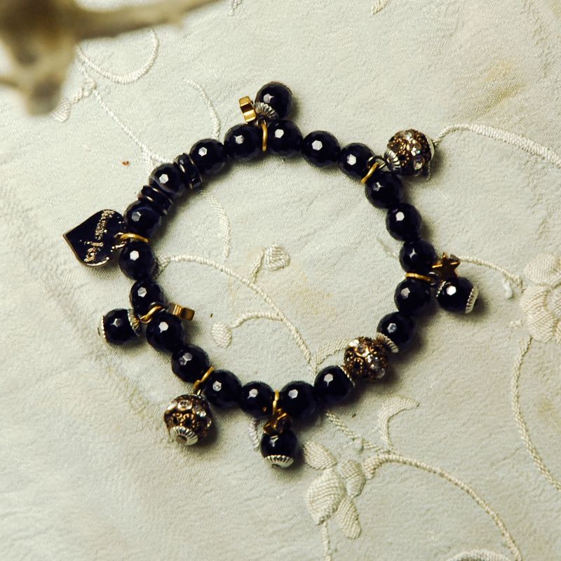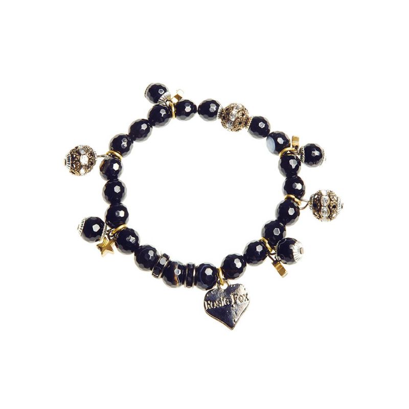 A beautiful handmade black onyx gemstone bracelet, adorned with crystal spheres, golden stars, crystal beads and the signature Rosie Fox heart.