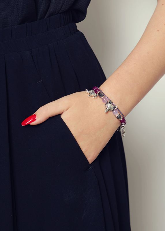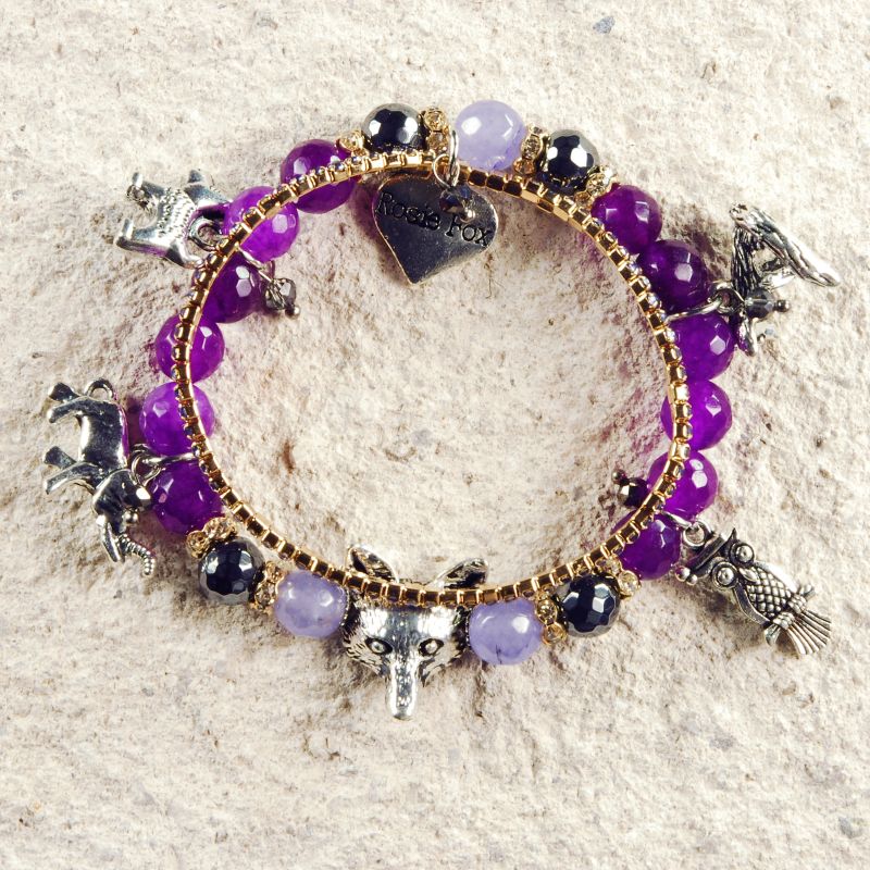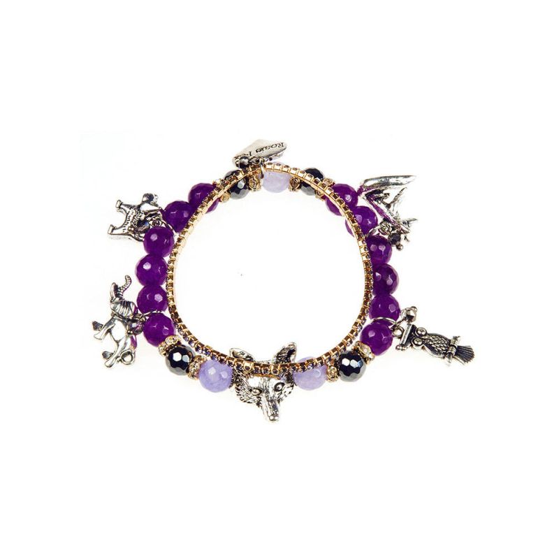Adorn your wrist with this wonderful double beaded charm bracelet. This bracelet comprises of a fine band set with purple crystals linked onto the beautiful berry beaded agate bracelet. This bracelet features gorgeous animal charms and is created from stunning agate beads in amazing hues of berry and and complimented with silver hematite beads inter-dispersed with rings of iridescent sparkling crystals.