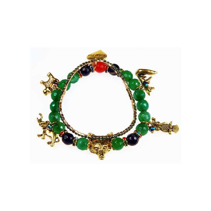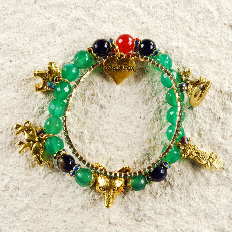 Adorn your wrist with this wonderful double beaded charm bracelet. This bracelet comprises of a fine gold band set with green stones linked onto the beautiful green beaded agate bracelet. This bracelet features gorgeous animal charms and is created from stunning agate beads in amazing hues of green and black and complimented with iridescent beads inter-dispersed with rings of rainbow sparkling crystals.