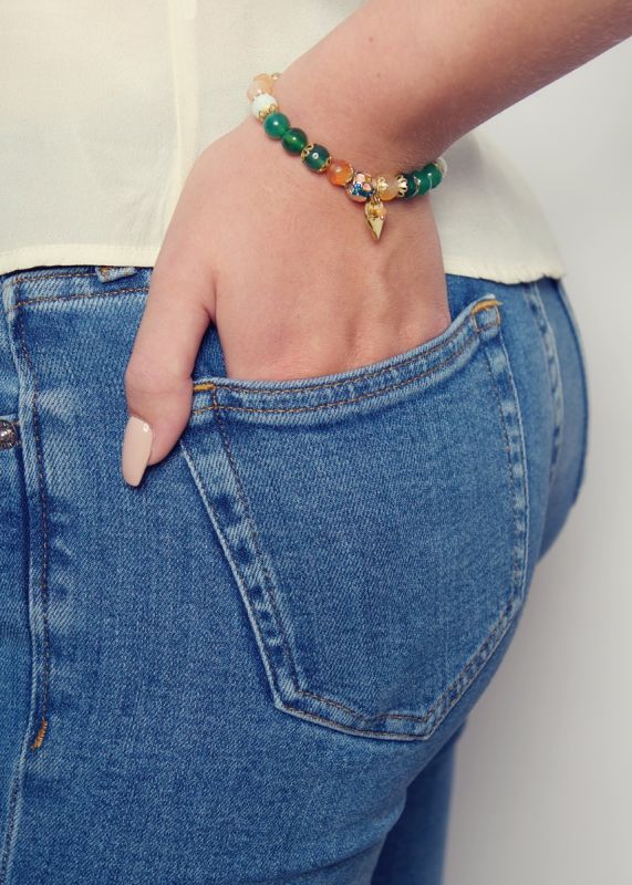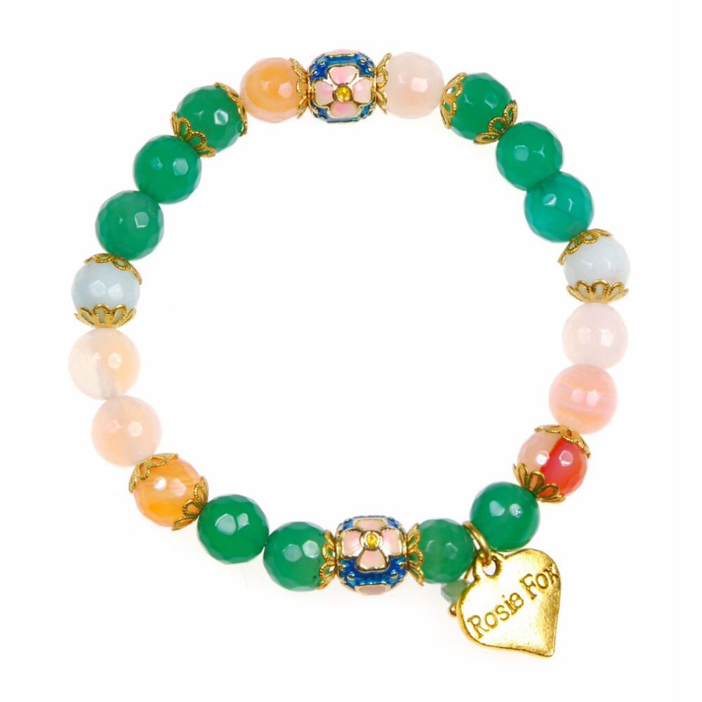 This beautiful beaded bracelet is the perfect Summer accessory. Handmade and gold plated using stunning agate beads in amazing hues of peach and green inter-dispersed with beautiful floral beads.