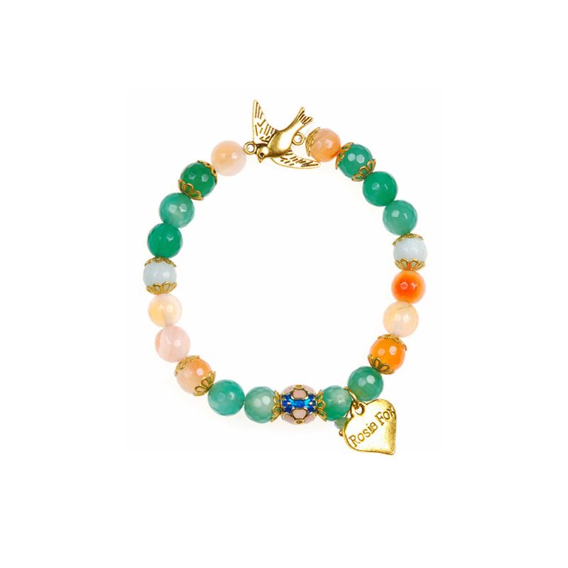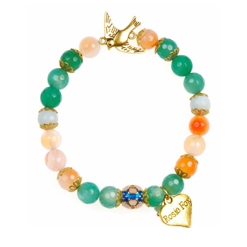Adorn your wrist with this wonderful beaded dove bracelet. Handmade and gold plated using beautiful peach and green agate beads inter-dispersed with stunning floral enamel beads.