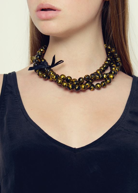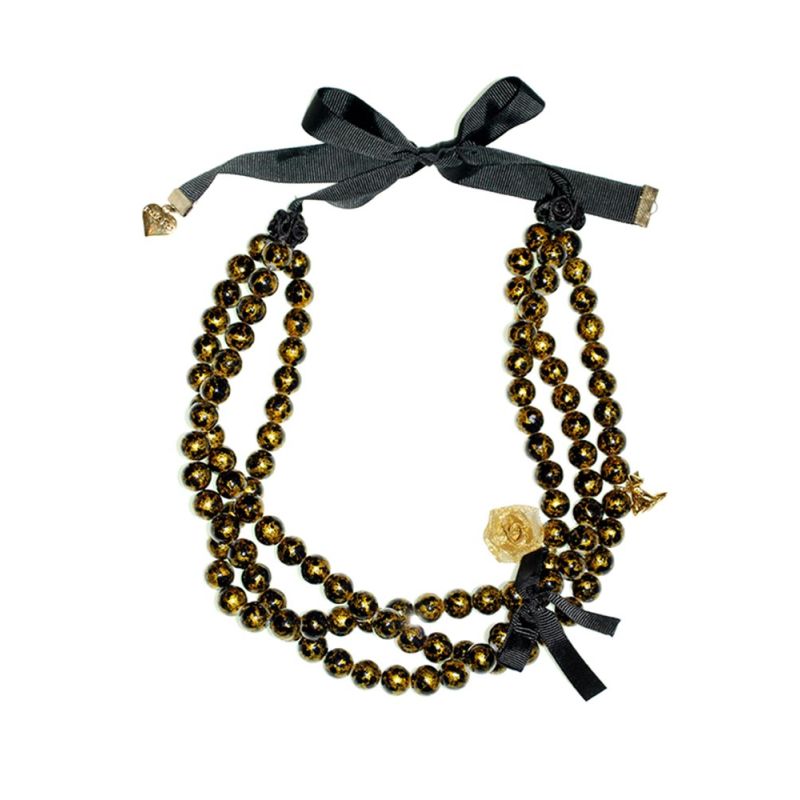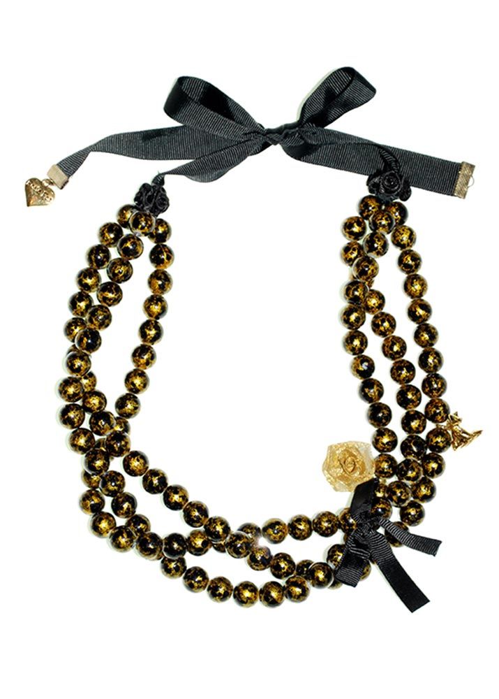 A striking statement bead necklaces. Handmade using beautiful midnight and gold fleck beads, twisted and adorned with the signature Rosie Fox gold charms. This necklace also has satin ribbon ties so can be worn at different lengths.
