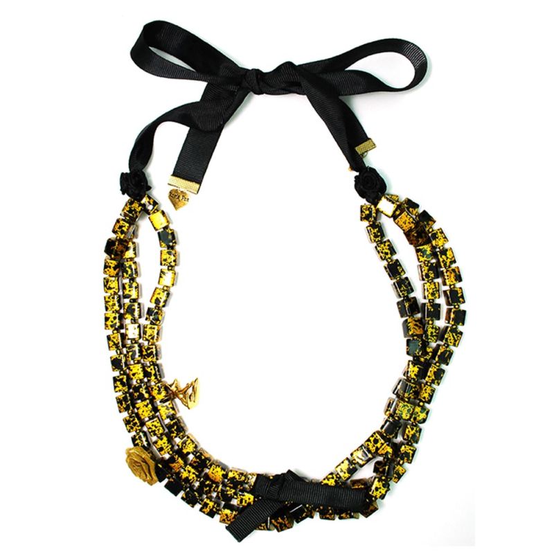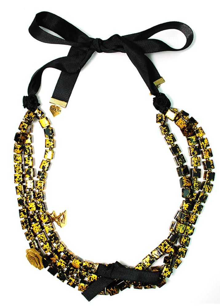 A striking statement necklace, made from fabulous gold and black cube beads with a black ribbon tie to make the necklace adjustable to fit all neck sizes and can be worn long or short.Cubes measure approx 0.8cm each