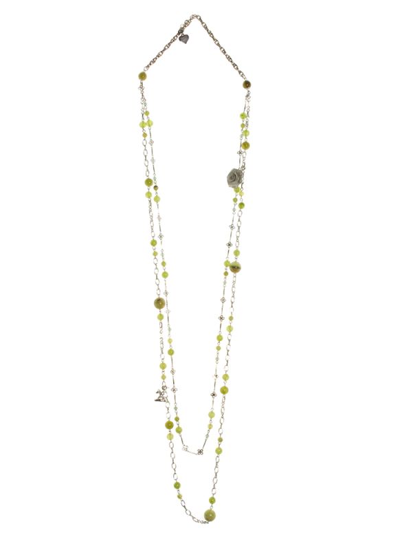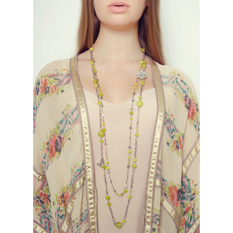 Multi-strand layered necklace with natural stone agate beads in olive shades, complemented by Rosie Fox's signature charms of a rose, fox and a "made with love" heart. 55cm drop