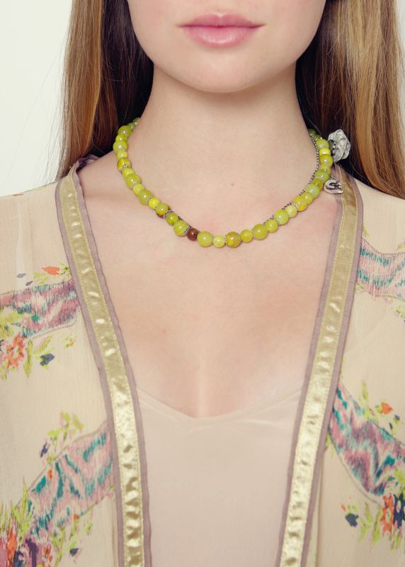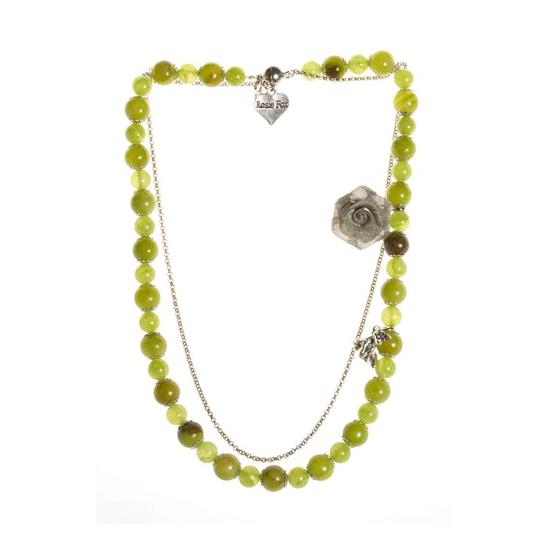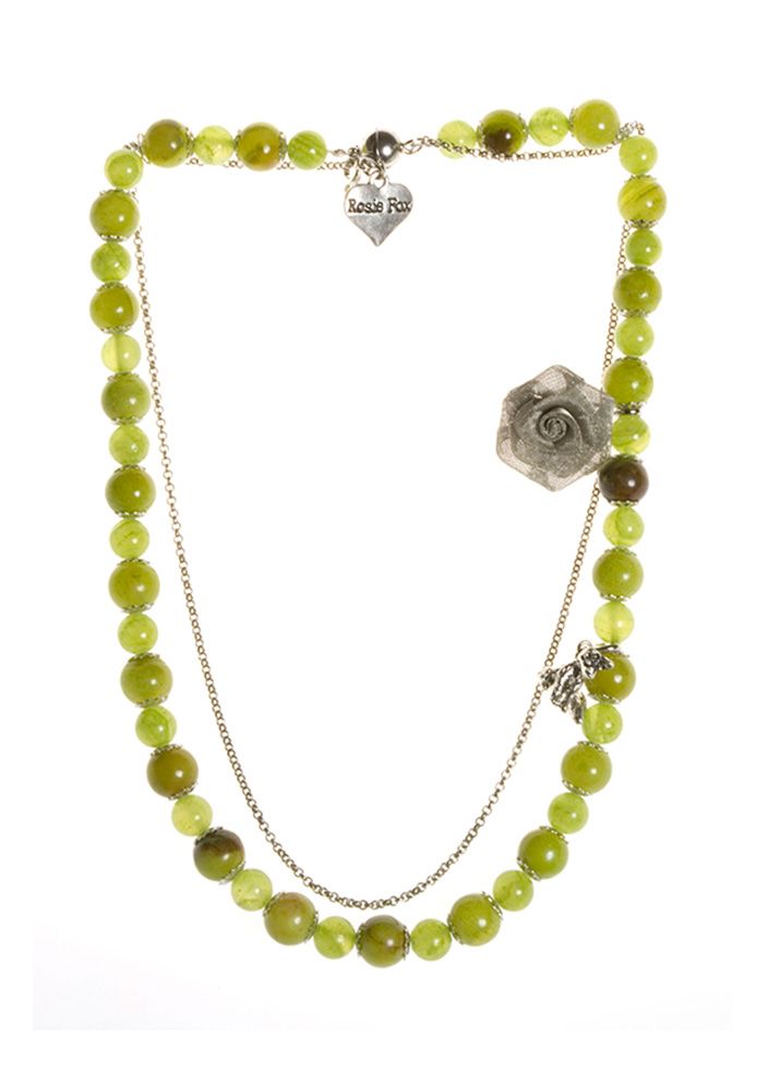 A charming single-strand natural stone agate bead necklace with olive shades, silver chain detail and a discrete beautiful rose charm. Suitable for all occasions. 22cm drop