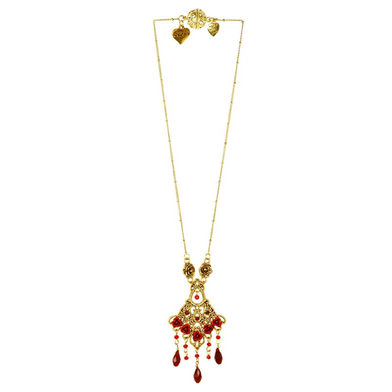 This elegant vintage necklace with exquisite rose detailing and crystal drops. Beautifully crafted and finished with a stunning crystal encrusted magnetic clasp and signature Rosie Fox heart charms. Approximately 28cm drop.