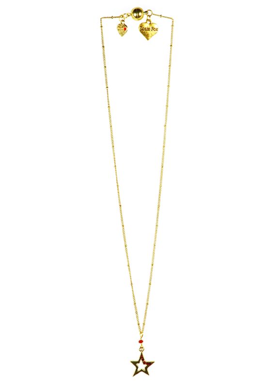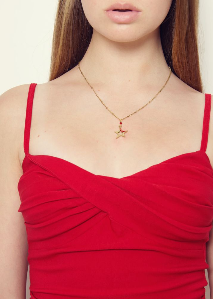 Lovely vintage style necklace featuring a ruby red glass crystal studded star and magnetic golden orb clasp. Approximately 26cm drop.