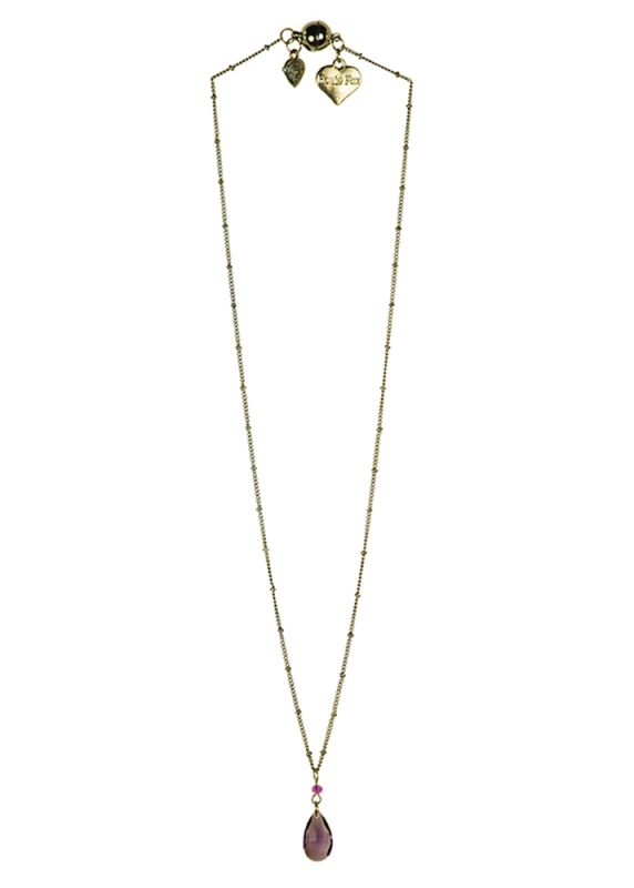 Glorious vintage styled plum glass drop necklace. Featuring Rosie Fox's heart charms and a magnetic golden orb clasp. Approximately 26cm drop.