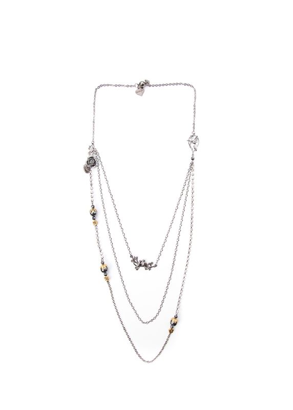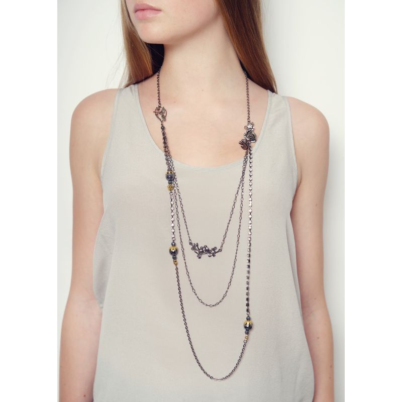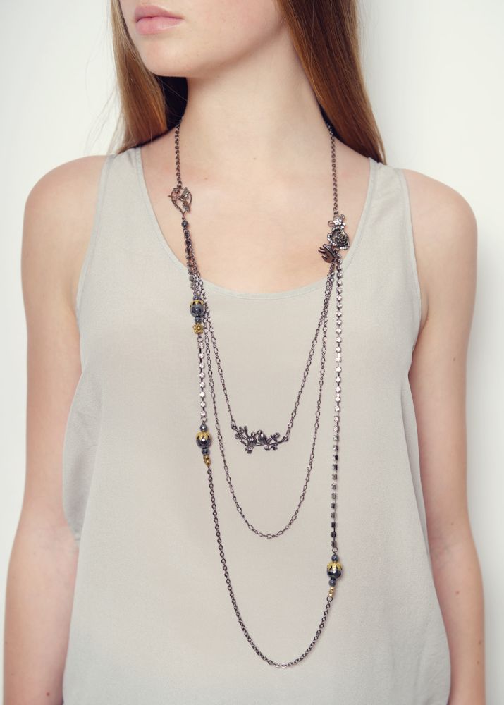 This dazzling triple chain necklace has so much to offer with its unique style. The hummingbird and flower feature gives it intrigue and its embellished crystal link will shimmer round your neck all day and night. Not forgetting the gemstones and large hematite elements coated with a gold crown. Make this your new statement piece this season. Includes signature Rosie Fox pendants.