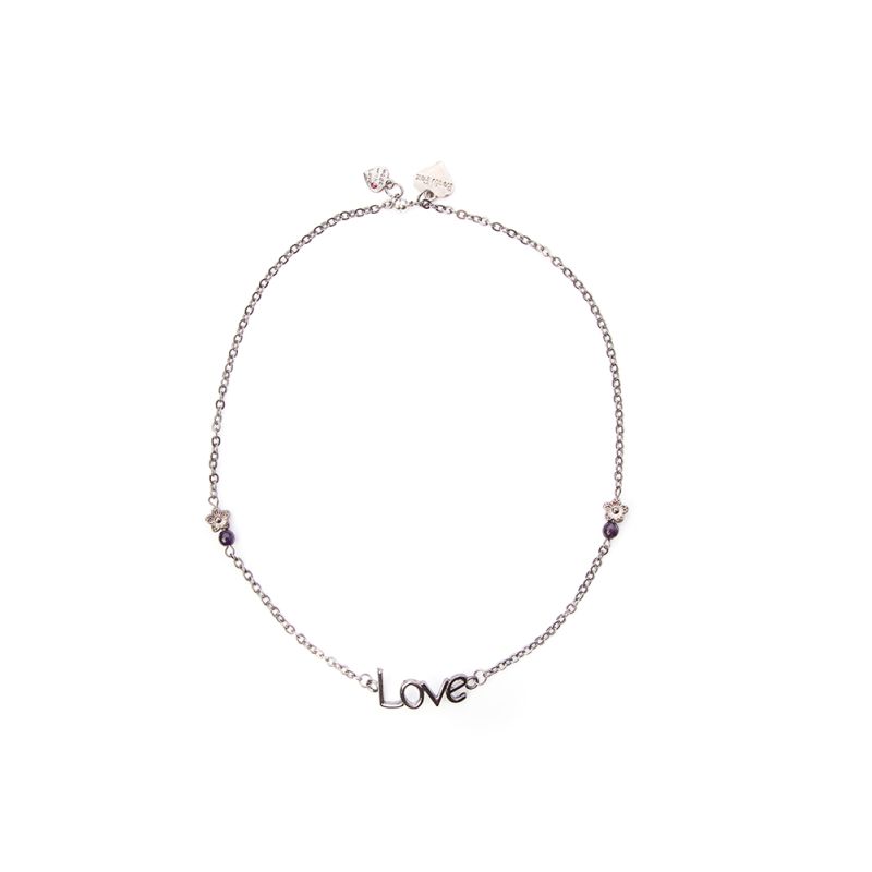 Elegant necklace with a central silver “LOVE” pendant, natural amethyst beads, a made with love heart charm and the signature fox and heart charms.