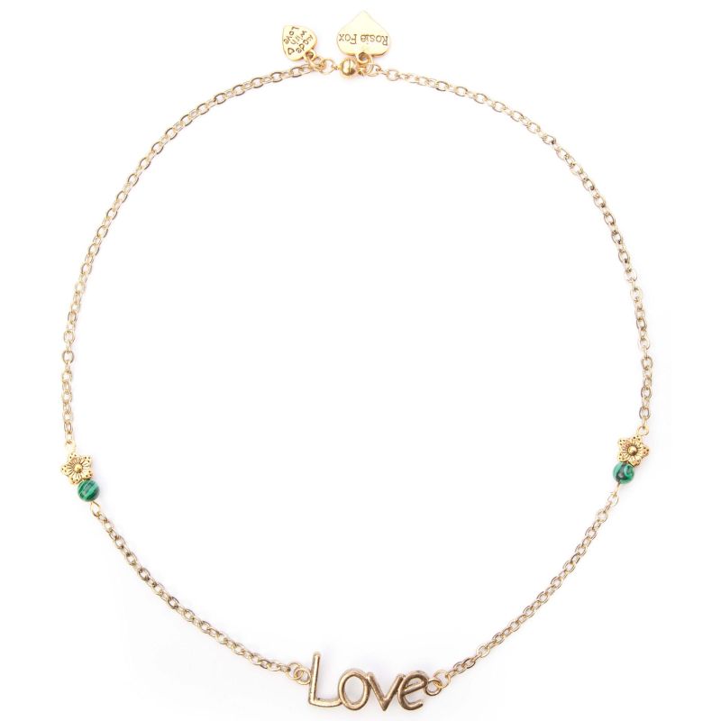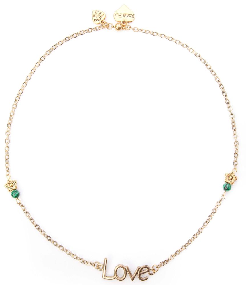 Elegant necklace with a central golden “LOVE” pendant, natural malachite beads, a made with love heart charm and the signature fox and heart charms.
