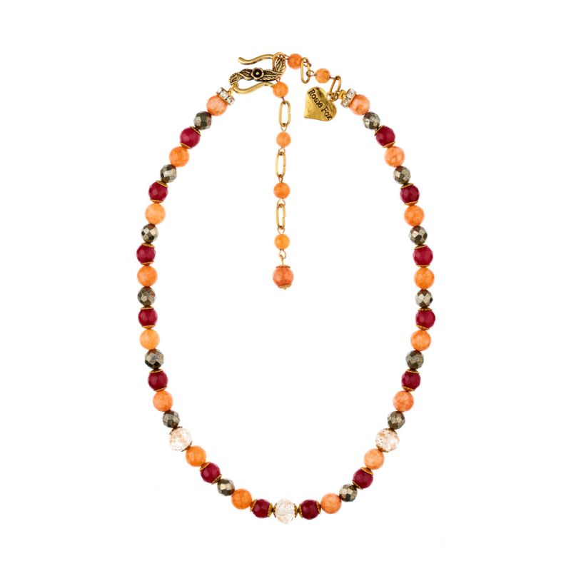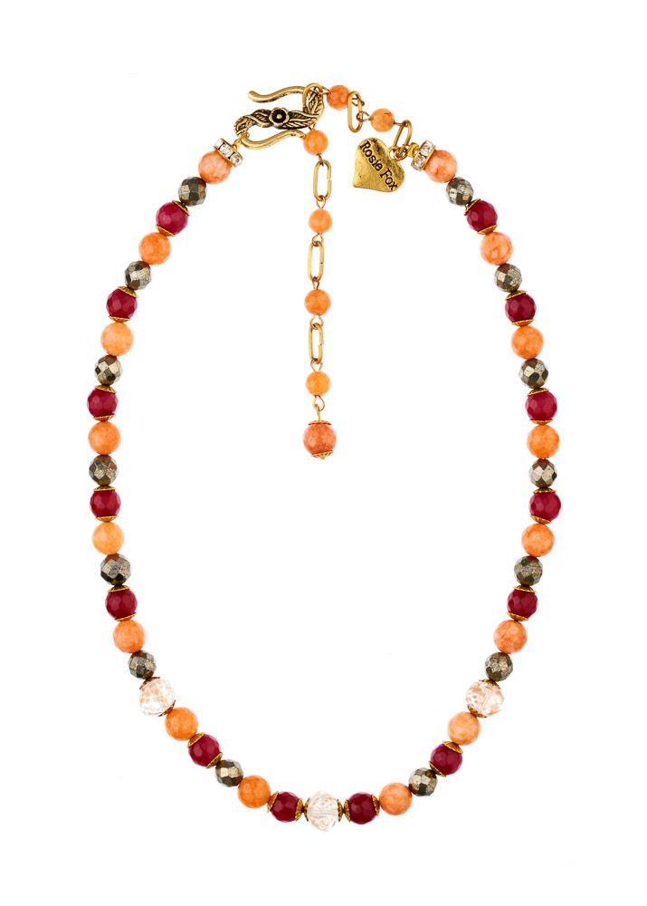 Get those feel-good summery feelings with this simple yet elegant beaded necklace. The necklace is made from gorgeous ruby-red and coral agate gemstones, crystal beads and luxurious gold pyrite, all of which work beautifully together to create this eye-catching, richly coloured necklace.