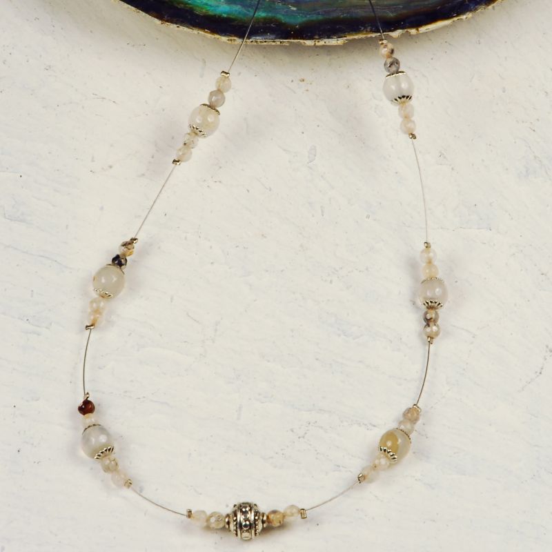 Get those feel-good summery feelings with this gorgeous necklace, created with two sizes of beautiful smoky quartz beads, each filled with natural grey tones and splashes of warm colours, and set on a delicate metal strand.