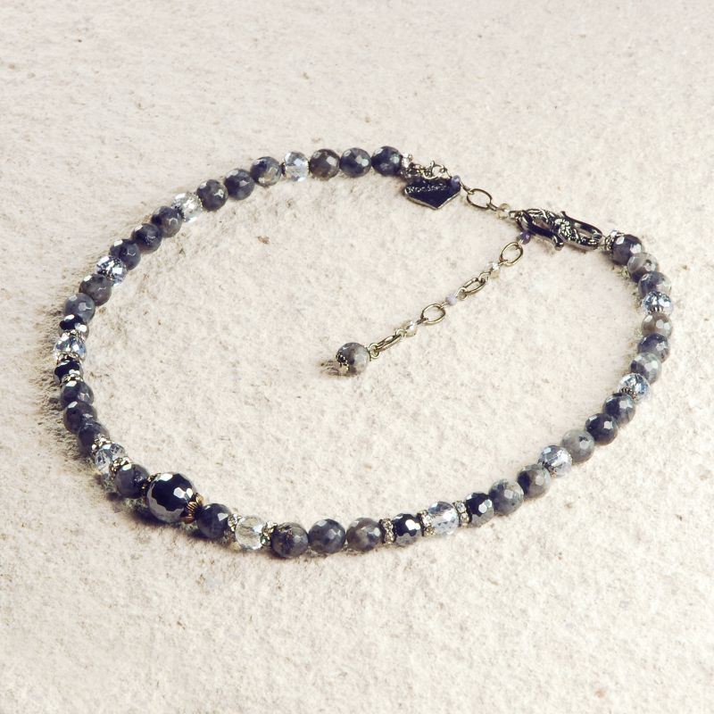 This beautiful beaded necklace is perfect for the party season. Handmade from slate grey agate and silver hematite beads, this necklace is truly stunning. Rings of sparkling crystals catch the light and the adjustable back chain is beautifully finished with a large agate bead, making this necklace perfect for wearing with your hair up.