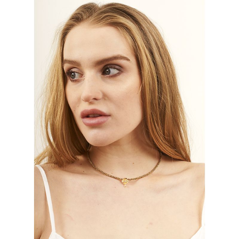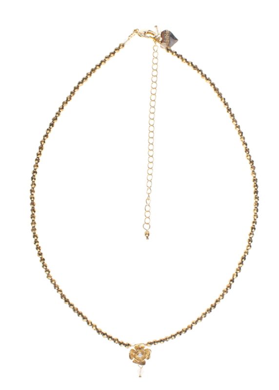 This is an elegant, handmade 14 carat Gold plated Rose charm necklace with Citrine & Pyrite beads.